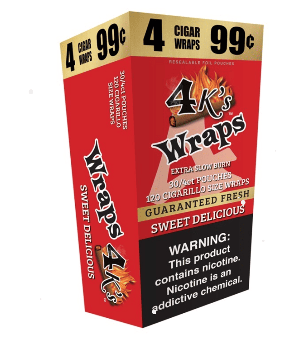 4 Kings Wraps are a popular choice for customers who want smooth, flavorful wraps with a dependable roll and an even burn. Known for their bold, crowd-pleasing lineup, 4 Kings flavored wraps are made for smokers who care about taste, aroma, and a consistent smoking experience. Whether you’re stocking up on your everyday favorite or trying something new, 4 Kings Wraps deliver a reliable session across the entire flavor range, including Sweet Delicious, Mango, Diamond, Watermelon, Blueberry, Black Sweet, and White Grape.