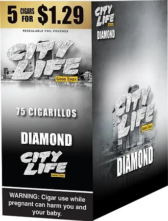City Life Cigarillos 5 for $1.29 Diamond 15 Packs of 5 are premium cigarillos crafted for adult smokers who enjoy a smooth, flavorful smoking experience. These convenient value packs are perfect for stocking up, resale, or everyday relaxation while you enjoy trusted quality and consistent burn. Buy City Life Cigarillos 5 for $1.29 Diamond 15 Packs of 5 online at discount prices and get fast shipping on one of today's most popular cigarillos brands.