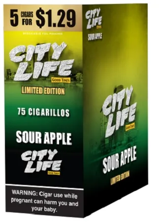 City Life Cigarillos 5 for $1.29 Sour Apple 15 Packs of 5 are premium cigarillos crafted for adult smokers who enjoy a smooth, flavorful smoking experience. These convenient value packs are perfect for stocking up, resale, or everyday relaxation while you enjoy trusted quality and consistent burn. Buy City Life Cigarillos 5 for $1.29 Sour Apple 15 Packs of 5 online at discount prices and get fast shipping on one of today's most popular cigarillos brands.