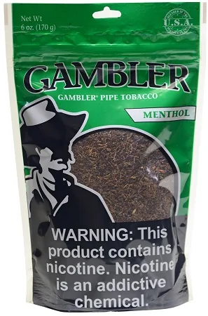 Gambler Pipe Tobacco Menthol (Mint) 6 oz. Bag offers premium pipe tobacco with a cool, refreshing menthol-mint profile, ideal for adult pipe smokers and roll-your-own enthusiasts. Packaged in a handy 6 oz. bag, this blend delivers consistent cut, easy packing, and a smooth, even burn in every bowl or RYO cigarette. Buy this Gambler pipe tobacco online in bulk to save on your everyday go-to blend.