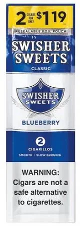 Swisher Sweets Cigarillos $1.19 Pre Priced 30 Packs of 2 Cigars Blueberry are premium flavored cigarillos designed for adult smokers who want rich flavor and a smooth, satisfying draw. Perfect for lounges, hookah bars, and home sessions, these value packs deliver consistent quality, slow burn, and bold taste every time. Buy Swisher Sweets Cigarillos $1.19 Pre Priced 30 Packs of 2 Cigars Blueberry online at discount prices and stock up on one of today's most popular flavored cigarillos options with fast, discreet shipping.