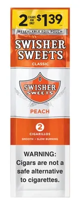 Swisher Sweets Cigarillos $1.19 Pre Priced 30 Packs of 2 Cigars Peach are premium flavored cigarillos designed for adult smokers who want rich flavor and a smooth, satisfying draw. Perfect for lounges, hookah bars, and home sessions, these value packs deliver consistent quality, slow burn, and bold taste every time. Buy Swisher Sweets Cigarillos $1.19 Pre Priced 30 Packs of 2 Cigars Peach online at discount prices and stock up on one of today's most popular flavored cigarillos options with fast, discreet shipping.