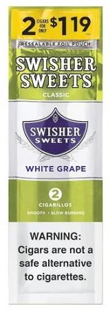 Swisher Sweets Cigarillos $1.19 Pre Priced 30 Packs of 2 Cigars White Grape are premium flavored cigarillos designed for adult smokers who want rich flavor and a smooth, satisfying draw. Perfect for lounges, hookah bars, and home sessions, these value packs deliver consistent quality, slow burn, and bold taste every time. Buy Swisher Sweets Cigarillos $1.19 Pre Priced 30 Packs of 2 Cigars White Grape online at discount prices and stock up on one of today's most popular flavored cigarillos options with fast, discreet shipping.