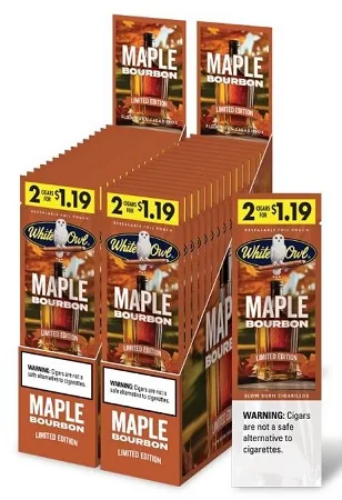 White Owl Cigarillos $1.19 Pre Priced 30 Packs of 2 Cigars Maple Bourbon are premium flavored cigarillos designed for adult smokers who want rich flavor and a smooth, satisfying draw. Perfect for lounges, hookah bars, and home sessions, these value packs deliver consistent quality, slow burn, and bold taste every time. Buy White Owl Cigarillos $1.19 Pre Priced 30 Packs of 2 Cigars Maple Bourbon online at discount prices and stock up on one of today's most popular flavored cigarillos options with fast, discreet shipping.